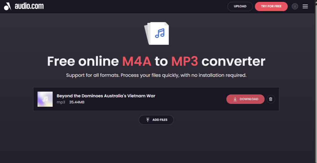 The file downloaded in an .m4a file type. To convert this to another file type, online free products exist. On this occasion I used audio.com’s Free online M4A to MP3 converter but you might like to experiment to find your own preferred converter.