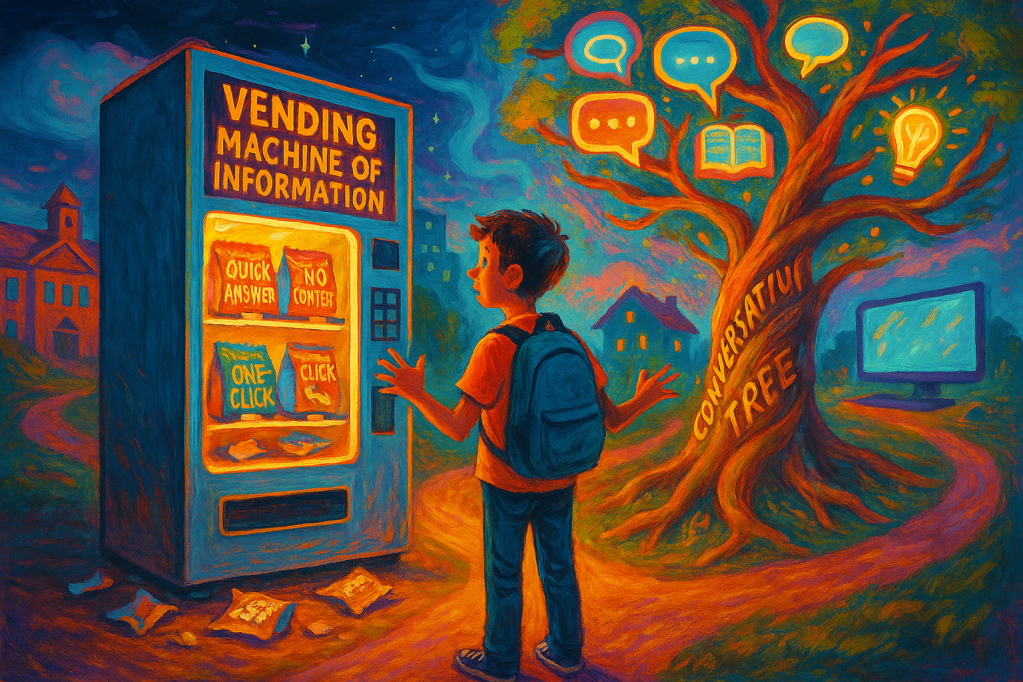Students are increasingly tapping into generative tools at school, at home, and beyond. But here’s the challenge: students don’t intuitively know how to hold a thoughtful, multi-turn conversation with an AI – just as many struggle to do so with humans. Their first instinct is too often to treat AI as a search engine, as a sort of vending machine for information. A usage characterised by asking a poorly considered question once, taking the first answer without reflection, and then moving on.