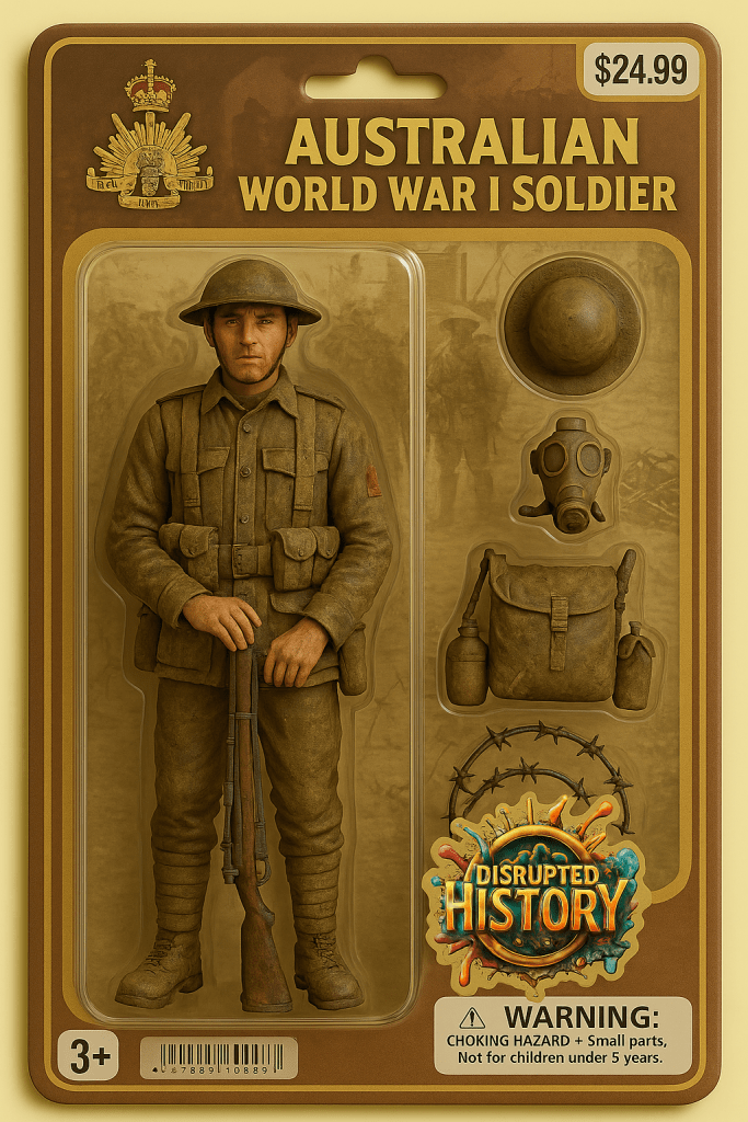 I am a teacher experimenting with the potential for historical learning in the creation of AI-generated action figures. I am interested in the ways colour, symbols, words, and other elements of design in toys might shape historical representations. Create a historically accurate action figure of Australian soldier from the trenches of the Western Front of World War 1 in lifelike colour. The soldier is in his 20s but is battle-weary and aged. He wears the full uniform of an Australian soldier in the frontline trenches. His equipment is muddied and dirty. His uniform and kit reflect the conditions of trench life. The figure is posed as if relaxing during a lull in the fighting. Include modern vibrant toy packaging with Australian World War 1 emblems and symbols, use a khaki and brown toned palette, and use archival newspaper clippings in the background. The action figure doll must be full body length and in “3 dimensional” plastic as if a real children’s toy. It must include accessory toy parts and pieces that reflect the reality of a soldier’s experience on the western front such as British gas mask, helmet, barbed wire, weapons and other military kit. All items must be related to a soldier’s life and work in the trenches. They should reflect historical primary source photographs, archives, and Australian museum collections. Include realistic product packaging details including price, barcode, safety warnings and so on.