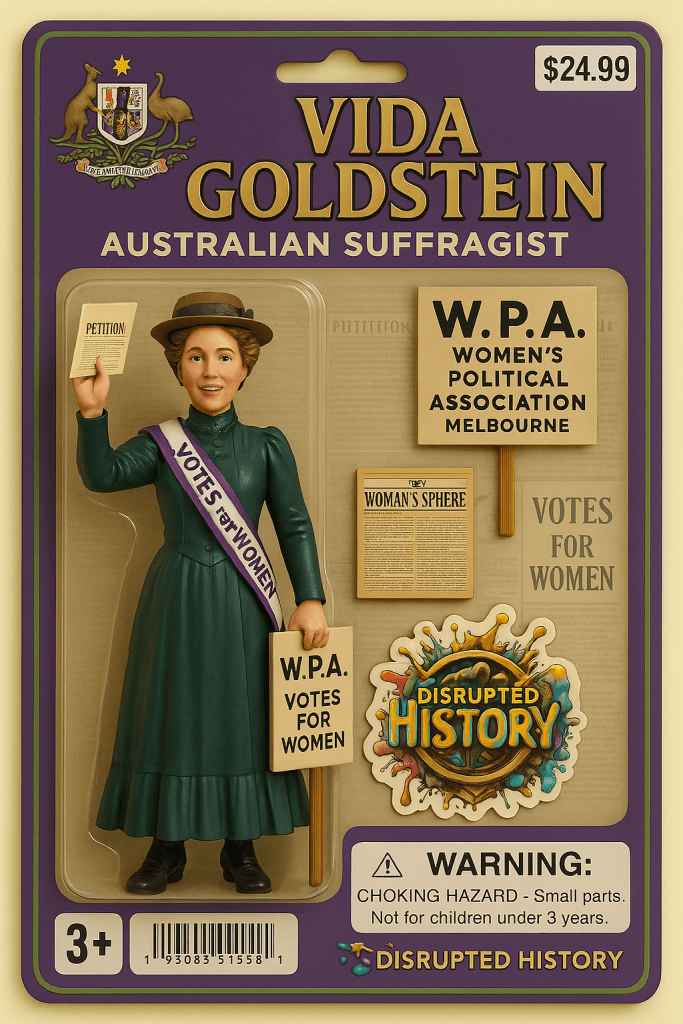I am a teacher experimenting with the potential for historical learning in the creation of AI-generated action figures. I am interested in the ways colour, symbols, words, and other elements of design in toys might shape historical representations. Create a historically accurate action figure of Australian suffragist Vida Goldstein in lifelike colour. She wears early 20th-century Edwardian dress with a suffrage sash reading ‘Votes for Women.’ The figure is posed as if giving a speech. Include modern vibrant toy packaging with Australian federation symbols, purple-green-white colour palette, and archival newspaper clippings in the background. The action figure doll must be full body length and in “3 dimensional” plastic as if a real children’s toy. It must include accessory toy parts and pieces such as newspapers and signs related to her life an work as a suffragist with the WPA and newspaper The Women’s Sphere. Include realistic product packaging details including price, barcode, safety warnings and so on.