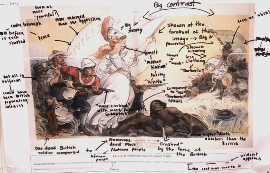 Establishing a substantial grounding of subject knowledge early in the unit empowers learning. Detailed content knowledge – what Swain would call “biologically secondary knowledge” – matters in history. When students, later in the learning cycle, are presented with historical sources to interpret, analyse and evaluate, they draw upon this knowledge. By doing so they are then able use skills to construct newer and deeper understandings – to make sense – more effectively. This effective learning is enabled or empowered because of their existing content understandings. On the basis of historical content understandings students are able to approach primary sources, including the pictorial sources my classes used this week, not as raw puzzles to solve, but as texts to interpret. Their abilities to detect multiple layered perspectives in an imperial map, to critique the antisemitic visual tropes in a 1919 Austrian cartoon, or question the narratives established through choices of imagery embedded in a battlefield photographs didn’t emerge spontaneously. It emerged because students had been equipped and empowered – with knowledge, routines, and teacher guidance. This knowledge, the routines, and the guidance were supported by a culture of learning.
