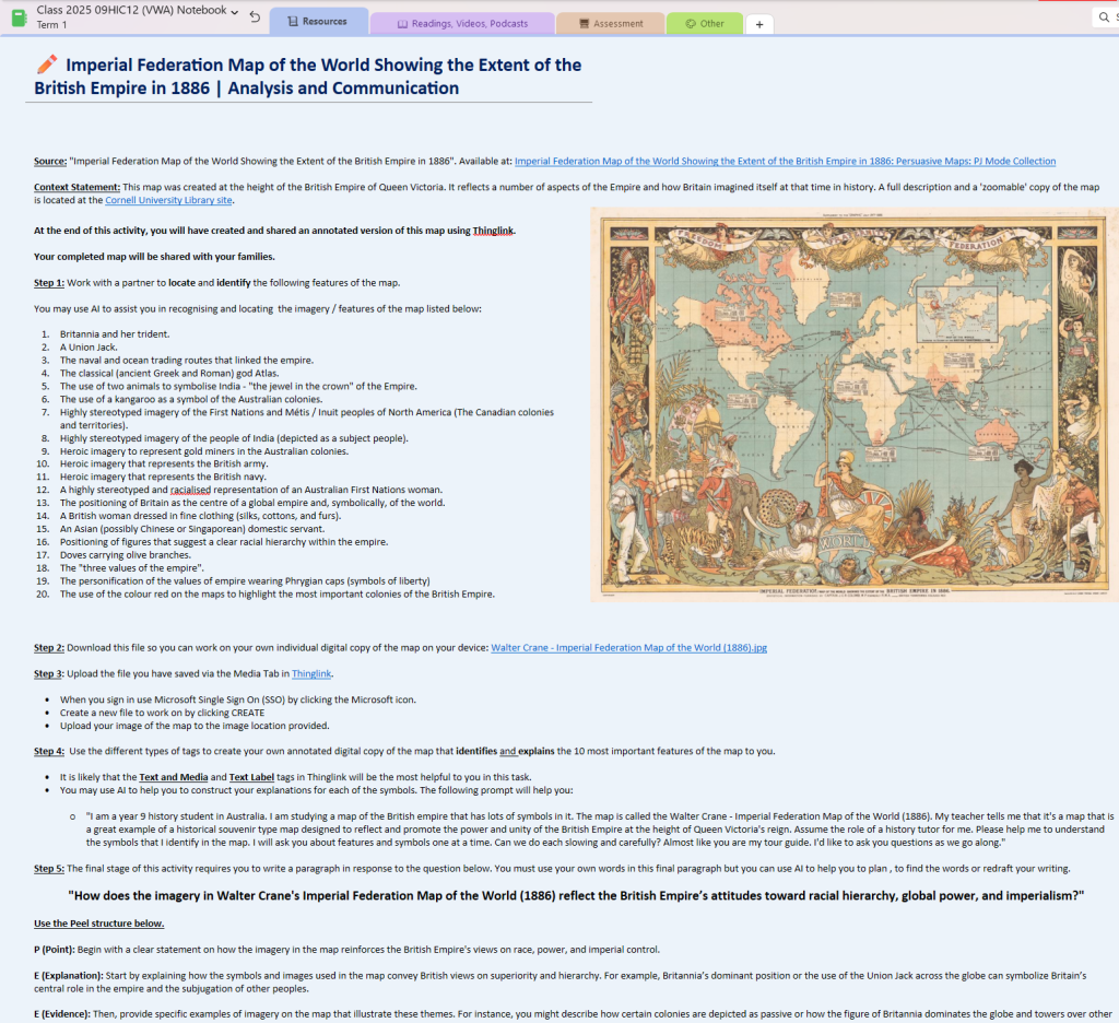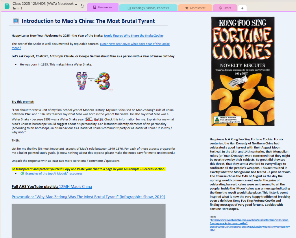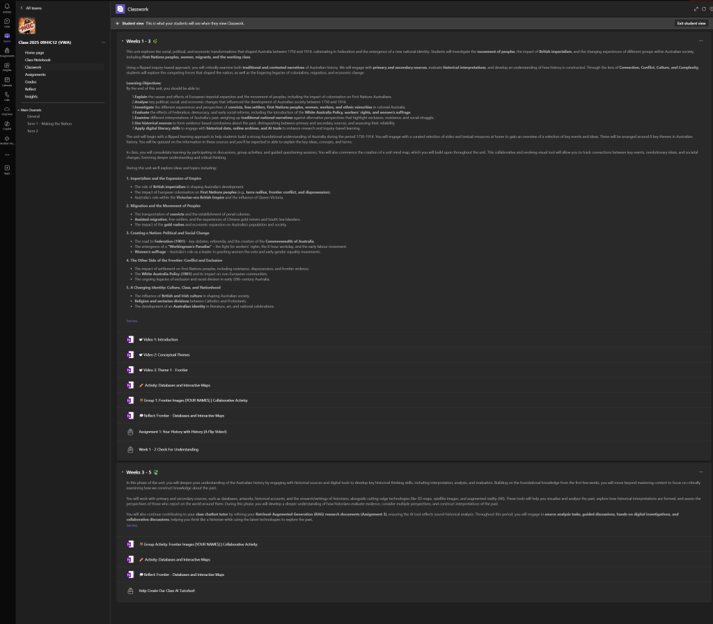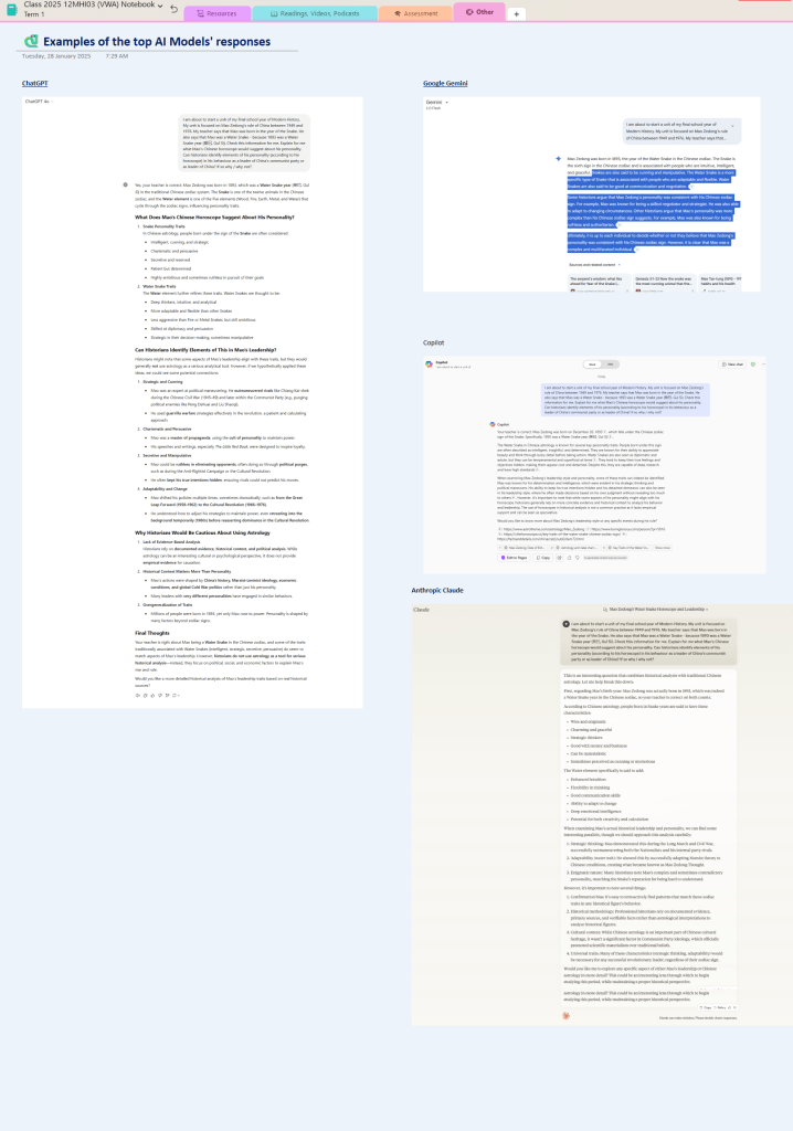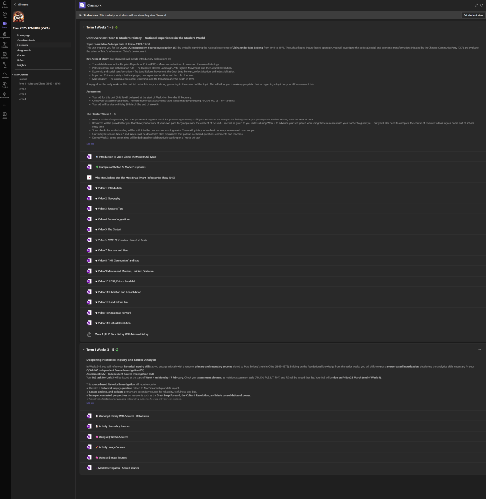 Student View: Modules 1 and 2 of Year 12 Modern History’s Classwork space in Microsoft Teams.Student View: Modules 1 and 2 of 12 Year 9 History’s Classwork space in Microsoft Teams.Teacher View: Analytics available to teachers via Microsoft Class Teams’ Insights. Student names have been redacted. Limited data has been collected at this point in the course (end of Term 1 Week 1, 2025.)Teacher View: Course framework and learning episode structure within Microsoft Teams Classwork Modules for Year 12 Modern History. Weeks / learning episodes within the module reflect the ‘seasonal structure for flipped, AI / tech infused, historical pedagogy discussed in This Teacher’s Journal: Blog Post 1 | January 24, 2025“What a good one looks like” – an example unit concept map provided to students via Microsoft OneNote. This example was created by a Year 7 student as part of their coursework (in 2023).“What a good one looks like” – an example unit concept map provided to students via Microsoft OneNote. This example was created by a Year 12 student.as part of their coursework (in 2023).“What a good one looks like” – an example unit concept map provided to students via Microsoft OneNote. This example was created by a Year 10 student as part of their coursework (in 2023).A screen capture of an introductory (Lesson1 or 2) activity using AI with Year 12 Modern History as they study Chinese history during the period 1949-76. Activities in this image reflect strategies discussed in Develop Student Skills in Using AI: A whole of school approachExample response to an introductory activity allowing students to experience see and discuss differences in AI platforms. The page models a transparent approach to working with AI.A tech-infused activity for the flipped classroom to be engaged with by students in Year 9 History.