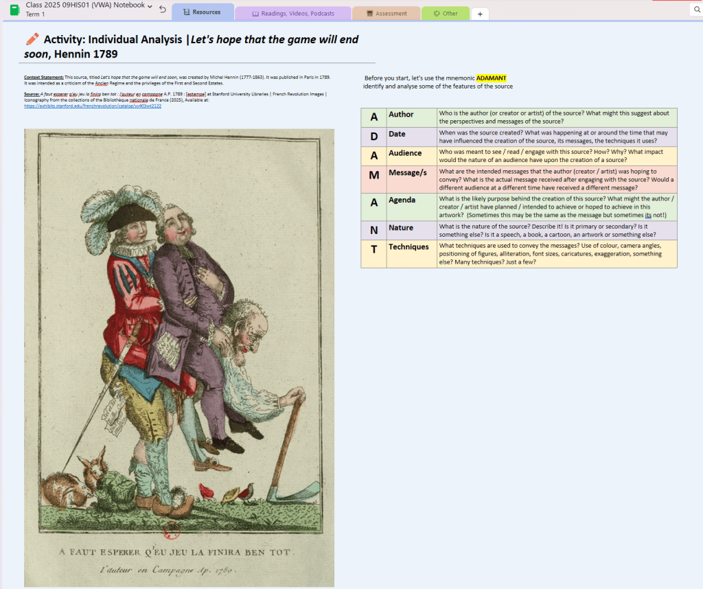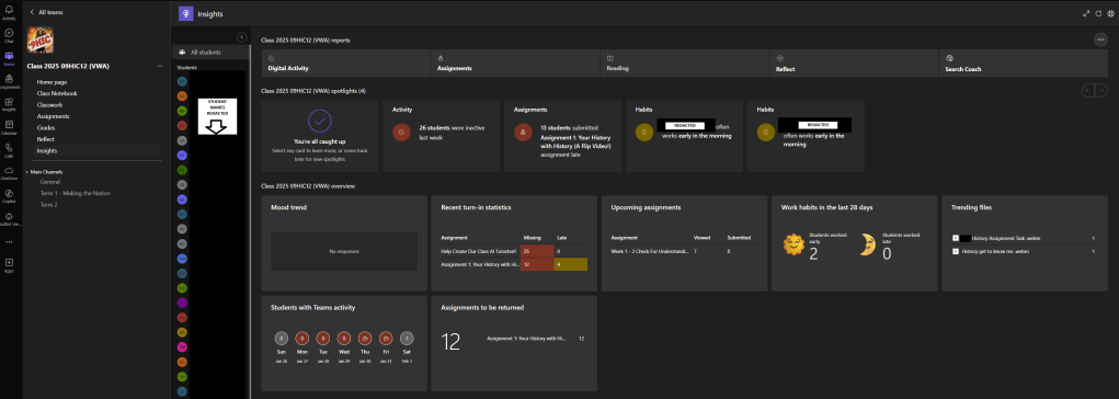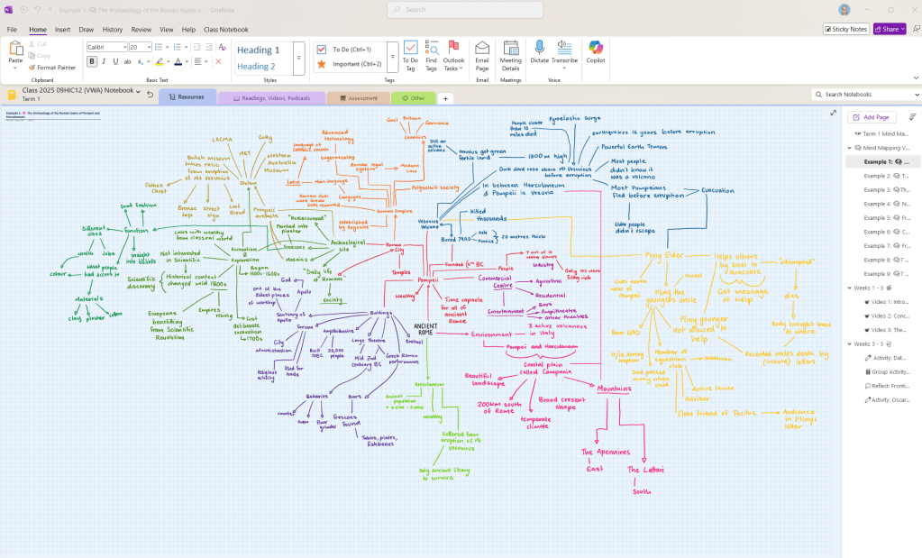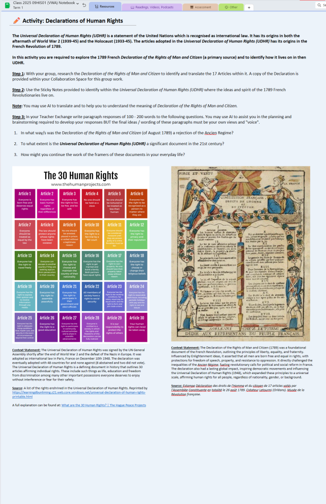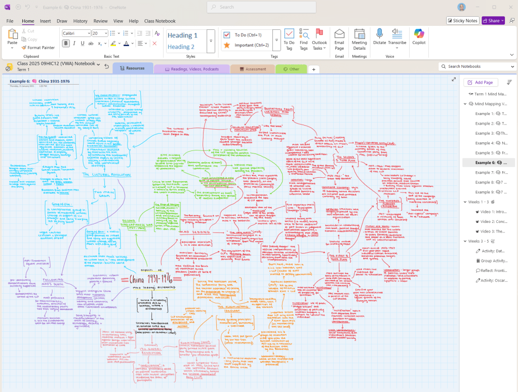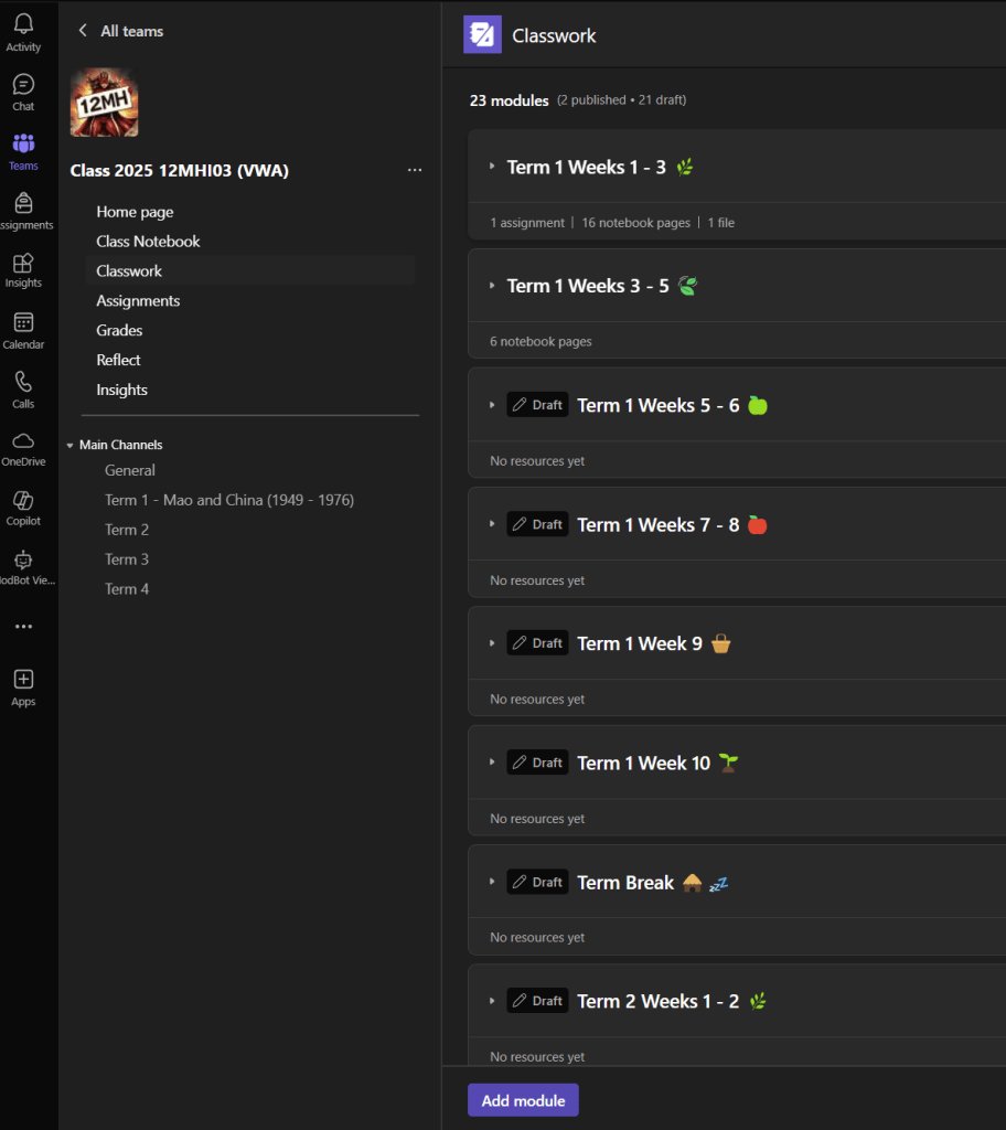 Student View: Modules 1 and 2 of Year 12 Modern History’s Classwork space in Microsoft Teams.Student View: Modules 1 and 2 of 12 Year 9 History’s Classwork space in Microsoft Teams.Teacher View: Analytics available to teachers via Microsoft Class Teams’ Insights. Student names have been redacted. Limited data has been collected at this point in the course (end of Term 1 Week 1, 2025.)Teacher View: Course framework and learning episode structure within Microsoft Teams Classwork Modules for Year 12 Modern History. Weeks / learning episodes within the module reflect the ‘seasonal structure for flipped, AI / tech infused, historical pedagogy discussed in This Teacher’s Journal: Blog Post 1 | January 24, 2025“What a good one looks like” – an example unit concept map provided to students via Microsoft OneNote. This example was created by a Year 7 student as part of their coursework (in 2023).“What a good one looks like” – an example unit concept map provided to students via Microsoft OneNote. This example was created by a Year 12 student.as part of their coursework (in 2023).“What a good one looks like” – an example unit concept map provided to students via Microsoft OneNote. This example was created by a Year 10 student as part of their coursework (in 2023).A screen capture of an introductory (Lesson1 or 2) activity using AI with Year 12 Modern History as they study Chinese history during the period 1949-76. Activities in this image reflect strategies discussed in Develop Student Skills in Using AI: A whole of school approachExample response to an introductory activity allowing students to experience see and discuss differences in AI platforms. The page models a transparent approach to working with AI.A tech-infused activity for the flipped classroom to be engaged with by students in Year 9 History.